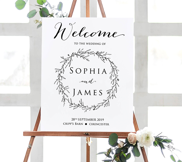 A beautiful wedding welcome sign to welcome all of your wedding guests. The sign has a modern calligraphy font with a pretty botanical wreath in a colour of your choice. Choose one of our selected fonts for the text in the wedding sign or you can choose your own font. We have a lovely selection of modern calligraphy fonts, classic wedding fonts and rustic/vintage fonts. If you don't see a font that you would like just let us know the font that you would like. The sign can be printed onto 300gsm white or cream card in smooth or laid textures. Brown kraft card is also available for a more rustic feel. The plan can also have a hardboard backing for standing alone on an easel or can be left without backing to put into a frame. A printable file version is also available. We can also provide frames upon request.